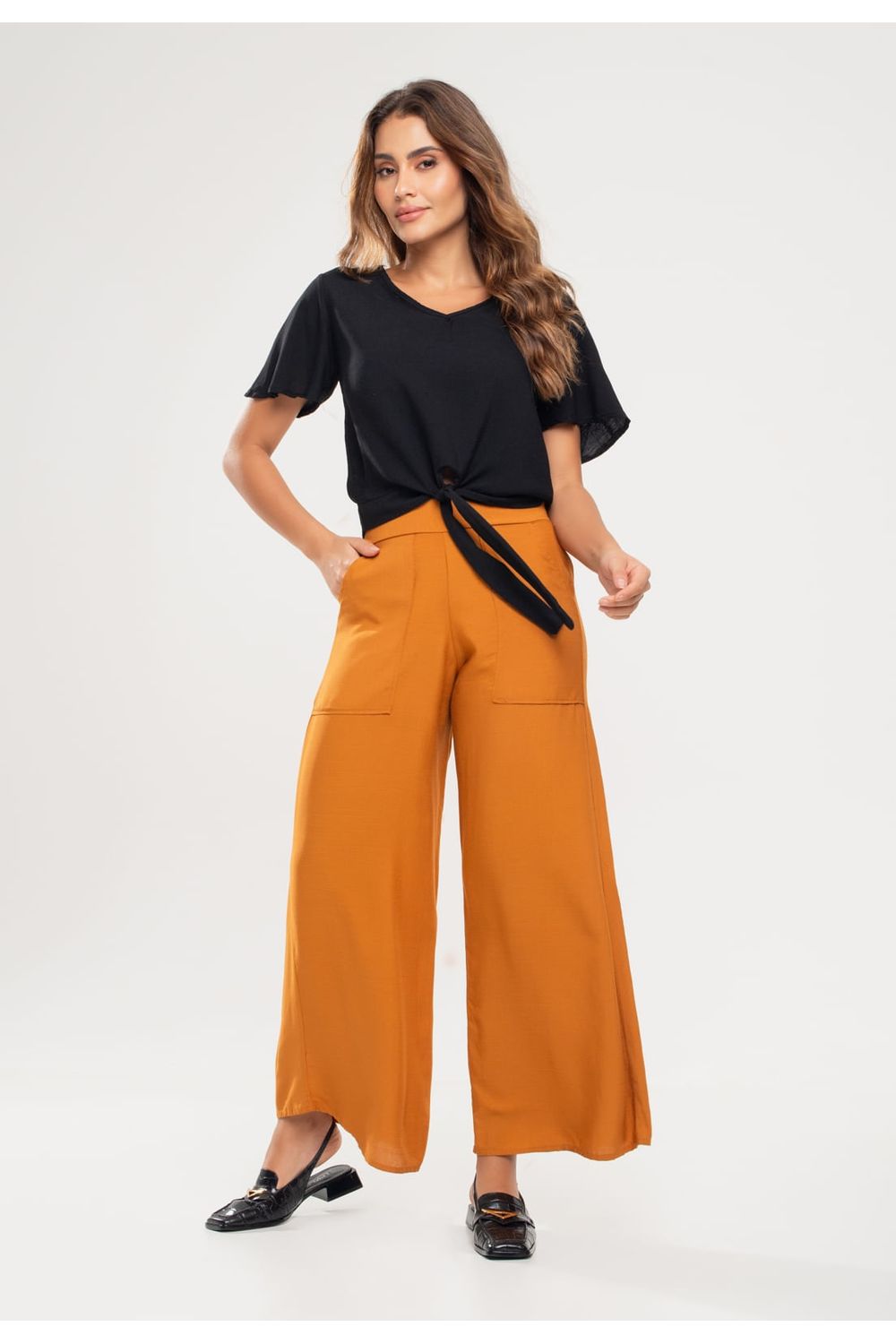 Calça Pantalona Com Bolso Viscolinho Mostarda Salvatore Fashion