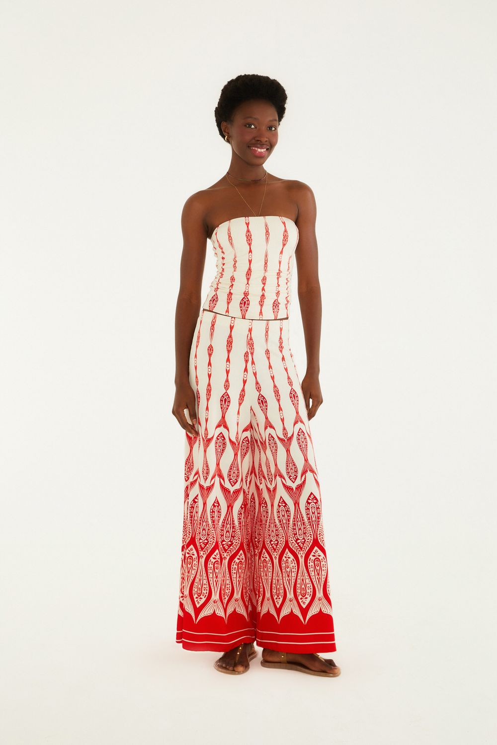 calça pantalona estampada peixe correnteza. modelagem ampla e fluida, ideal para um toque casual e sofisticado. cintura alta com cós elástico, proporcionando conforto ao vestir. perfeita para dias de verão e eventos ao ar livre ou aquele passeio especial. FARM RIO original - alto verão 26.-