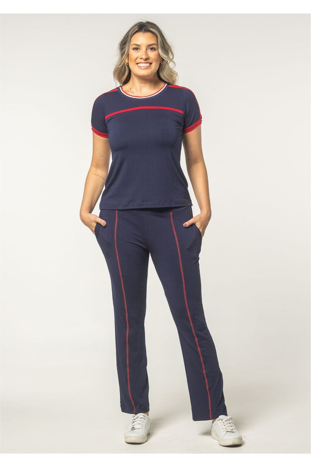 Calça básica na cor Azul Marinho com costura trançador vermelho na vertical