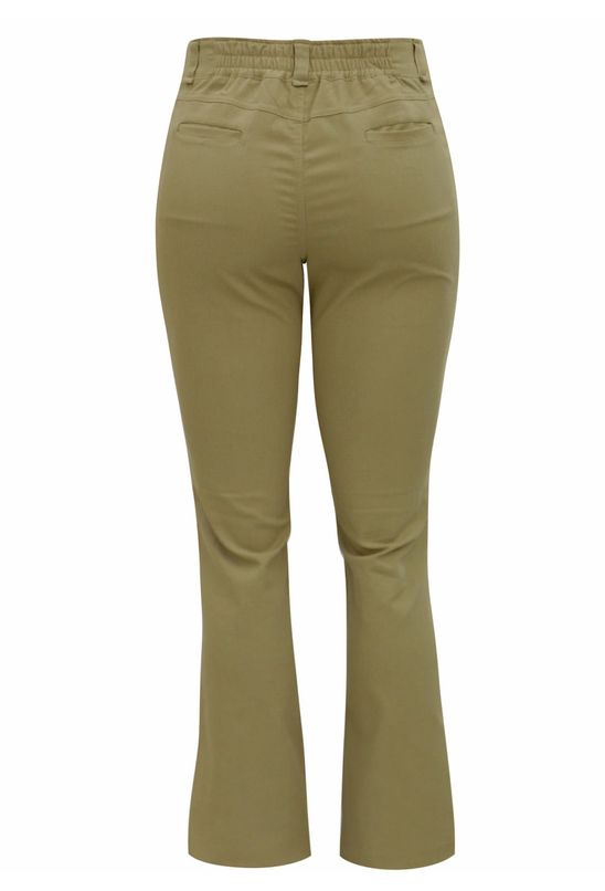 Calça em sarja “adamascada”, na cor Cáqui. fechamento através de zíper e botão.