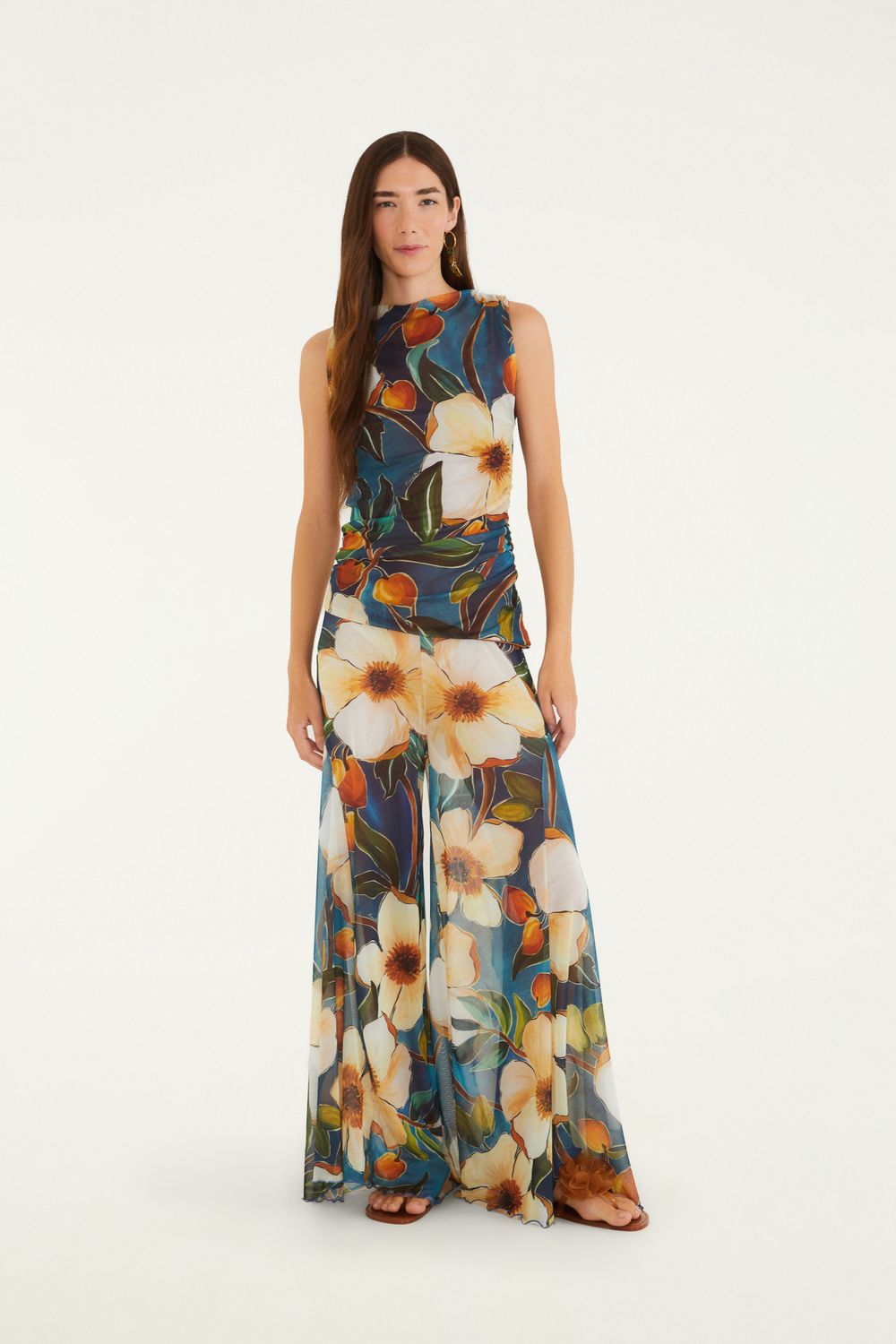 calça recorte tule estampada jardim litoral. apresenta cintura alta e caimento fluido que traz leveza em todos os movimentos. os recortes em tule proporcionam um toque único à peça. perfeita para um passeio na praia ou um encontro casual. a versatilidade e o charme se destacam em qualquer ocasião. FARM RIO original - verão 26.-