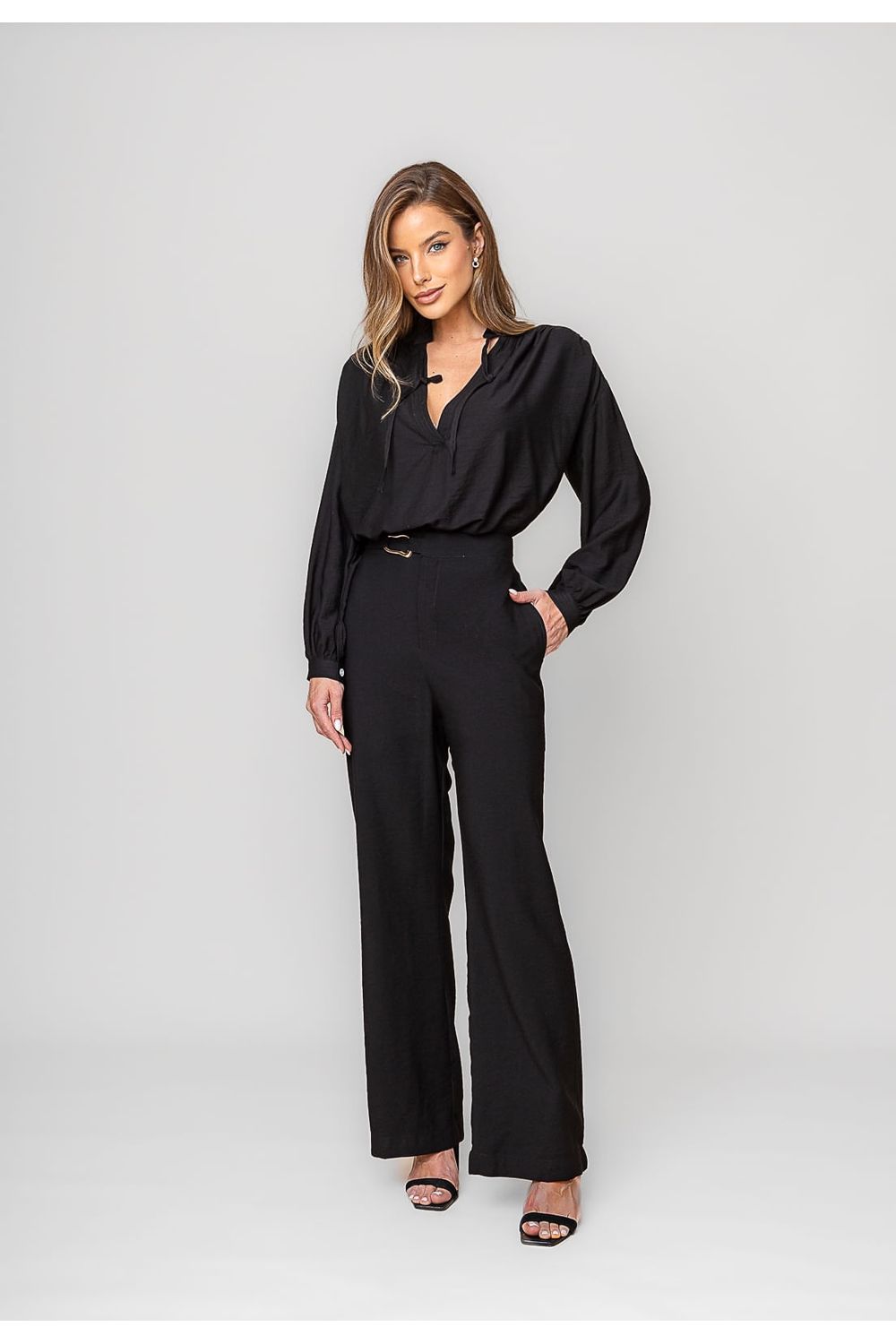 Confeccionada em tecido leve com toque macio e estrutura fluida, a peça valoriza a silhueta com sua cintura alta, bolso nas laterais e cinto com fivela dourada, que adiciona um toque sofisticado e feminino. O corte reto garante um visual alongado e elegante, perfeito para quem busca uma produção equilibrada entre conforto e formalidade.