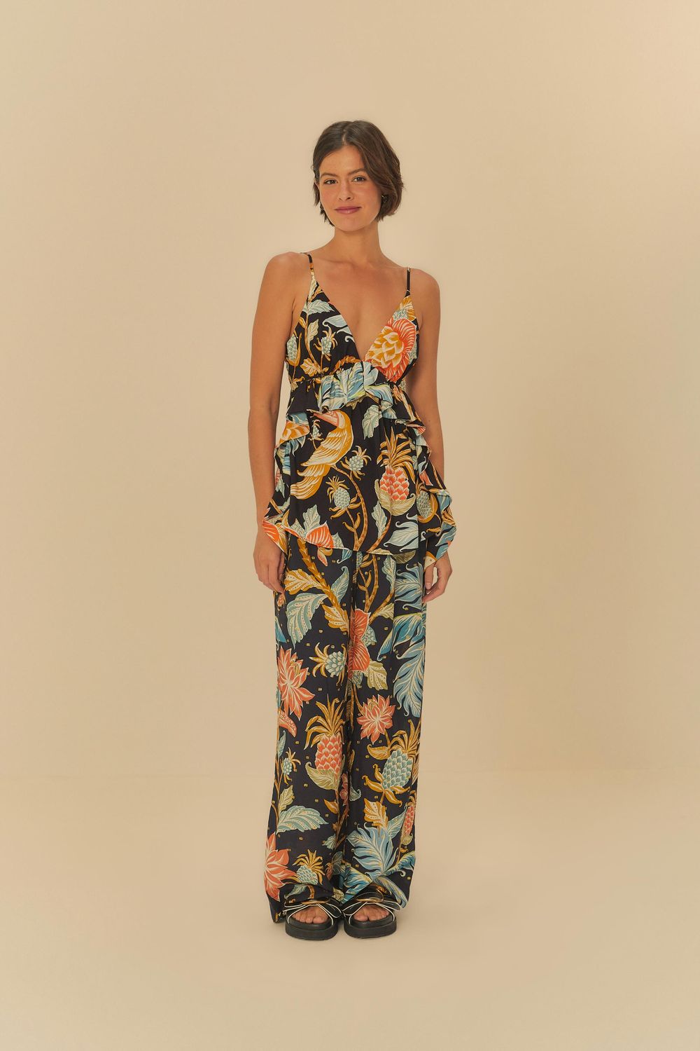 calça reta estampada amalfi é uma peça única que captura a essência vibrante da FARM. com corte reto e fluido, proporciona conforto em qualquer ocasião. o cós com elástico ajusta delicadamente e os detalhes únicos elevam o visual. ideal para um almoço casual ou um passeio descontraído. FARM RIO original - inverno 25.-