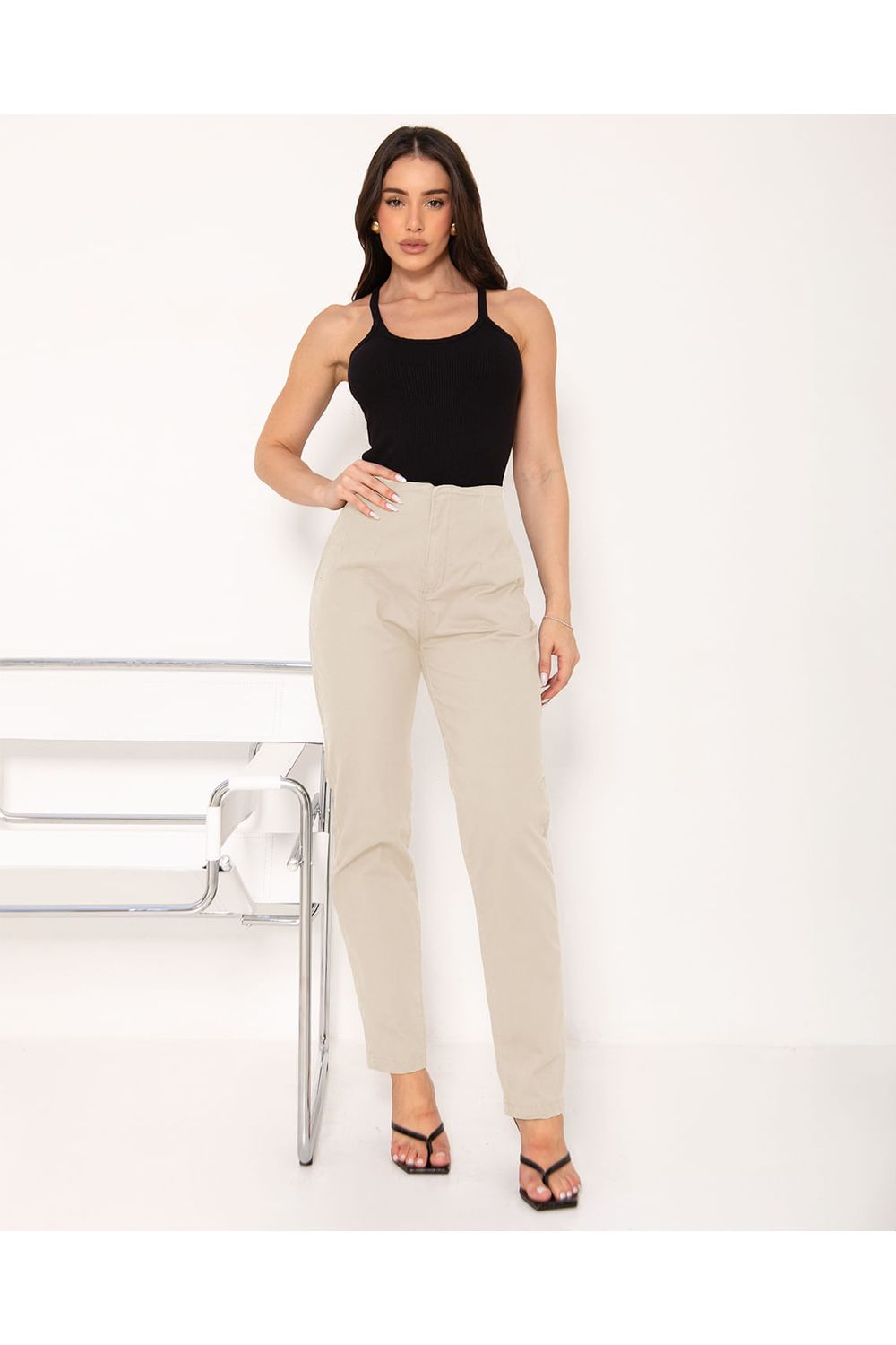 - Cintura Alta com Quadril Levemente Ajustado com Caimento Reto da Coxa a Barra.