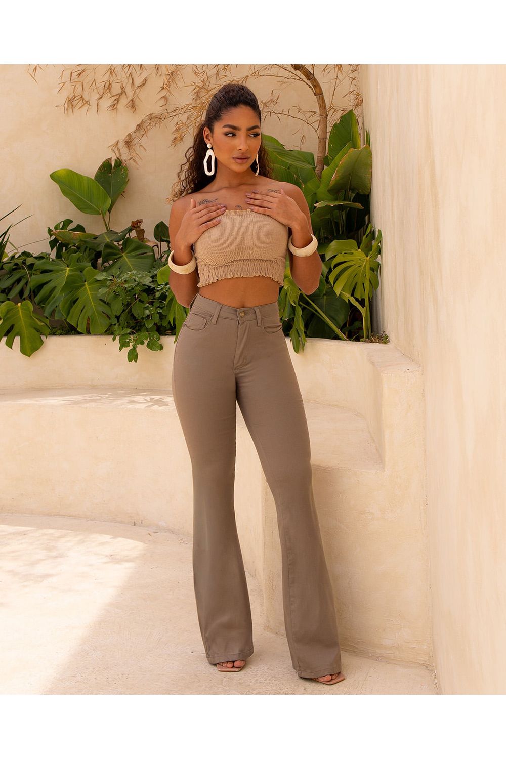 Calça Sarja Feminina Flare Cintura Alta 25098 Caqui