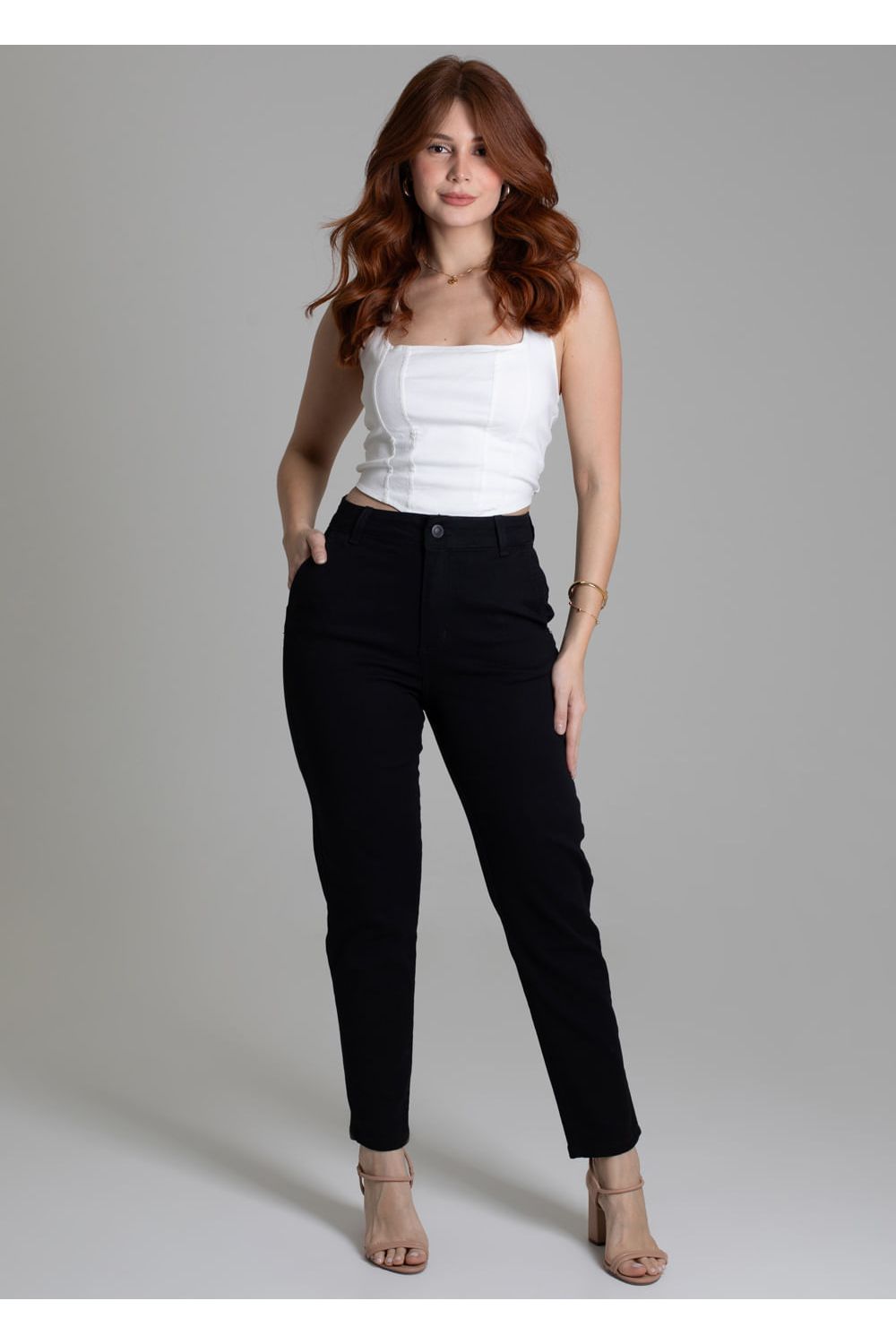 Calça mom confeccionada em sarja. A modelagem mom tem um caimento soltinho nos quadris e coxas ajustando até o tornozelo. Cintura alta Fechamento com botão e zíper Bolsos frontais falsos e bolsos traseiros funcionais Barra simples Modelagem: Mom Tecido: Sarja Tipo de lavagem: Color Cor: Preto-