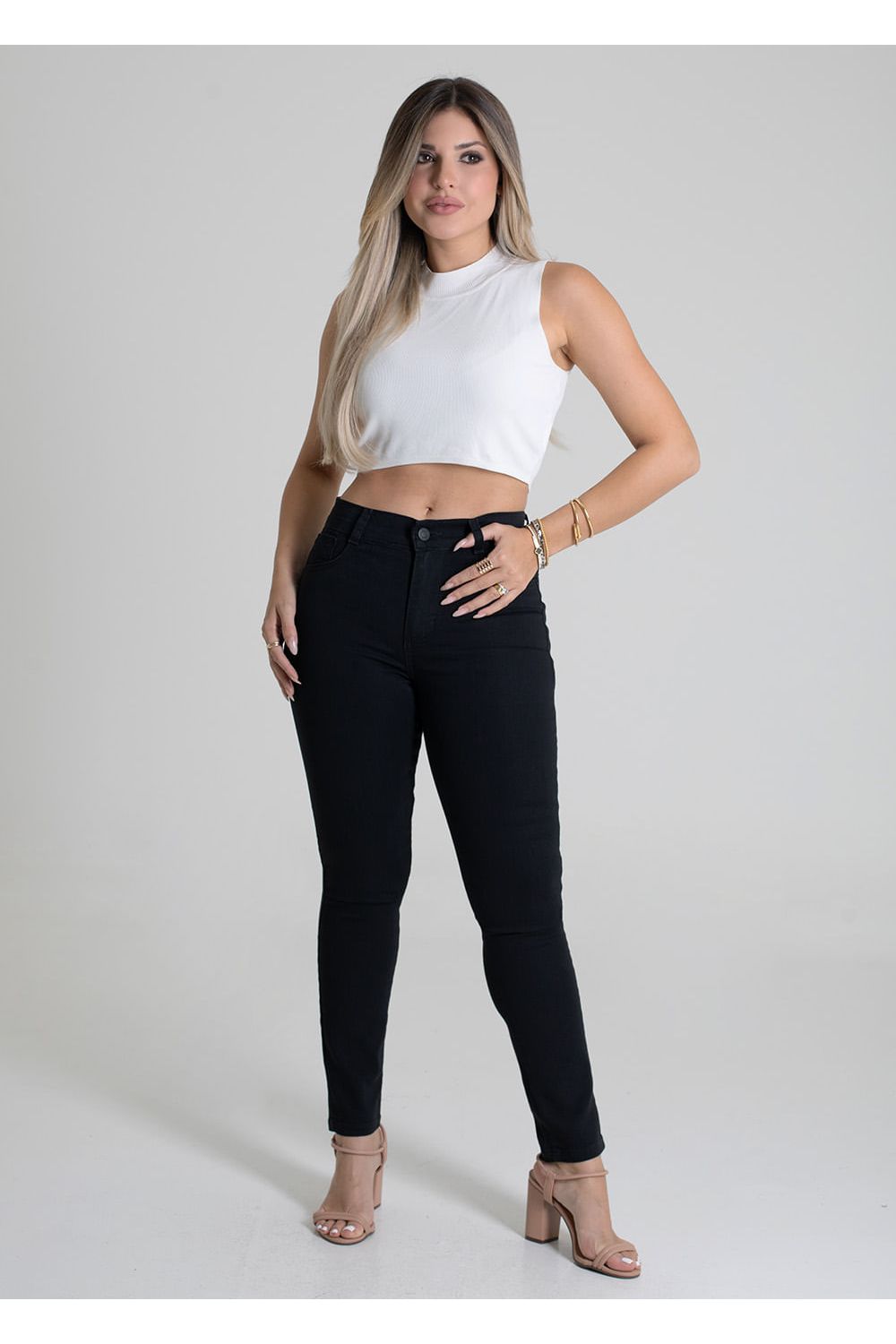 Calça skinny confeccionada sarja .A modelagem é com caimento super ajustado ao corpo Cintura alta Fechamento com botão metálico e zíper Bolsos frontais falsos e bolsos traseiros funcionais Barra simples Modelagem: Skinny Tecido: sarja Tipo de lavagem: sarja Cor: preta-