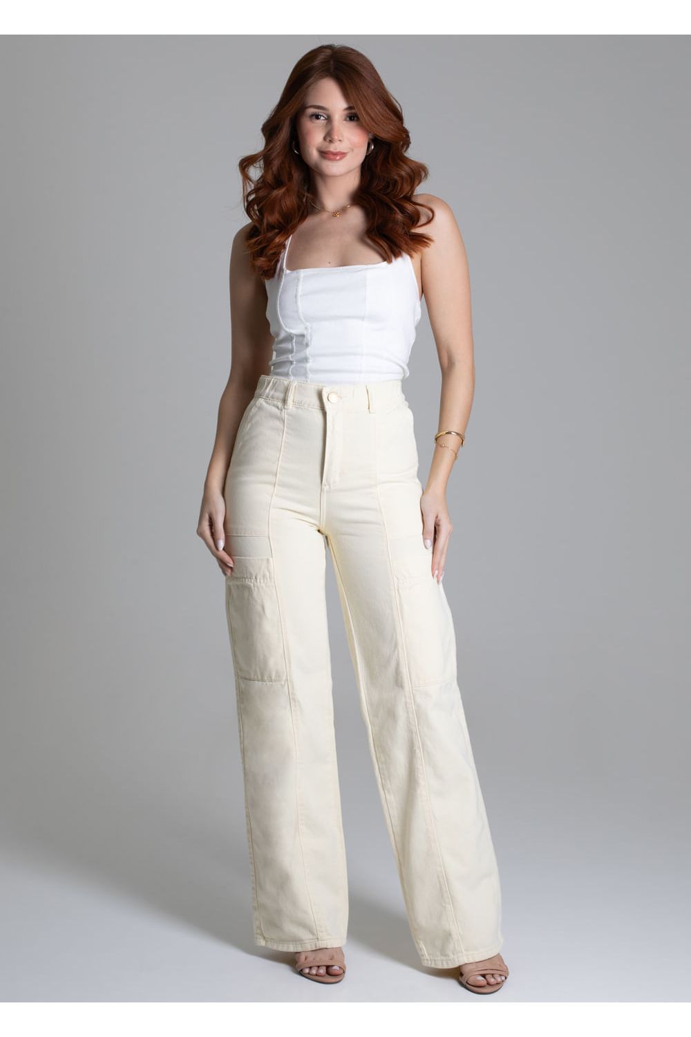 Calça feminina confeccionada em sarja. O modelo possui cintura super alta, gancho no lugar e caimento amplo da coxa até a barra. Cintura alta Fechamento através de um botão e zíper Bolsos frontais e posteriores funcionais Barra simples Tecido: Sarja Tipo de Lavagem: Color Cor: Amarelo-