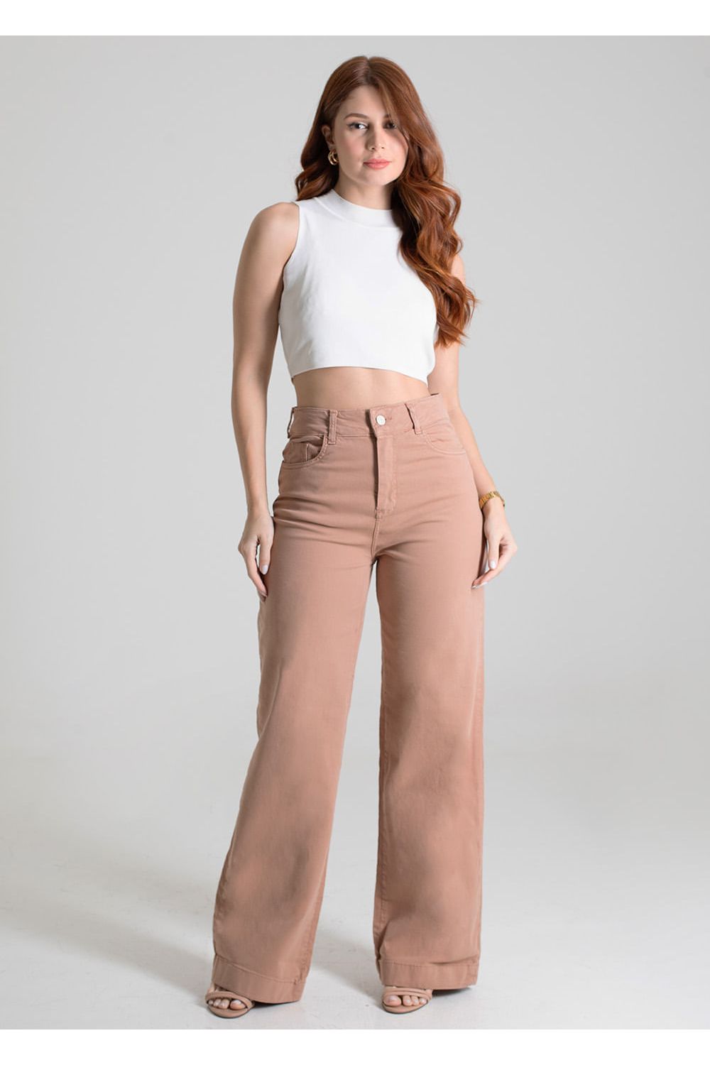Calça feminina confeccionada em sarja. O modelo possui cintura super alta, gancho no lugar e caimento amplo da coxa até a barra. Cintura alta Fechamento através de um botão e zíper Bolsos frontais faca e posteriores funcionais Barra simples Tecido: Sarja Tipo de Lavagem: Color Cor: caqui-