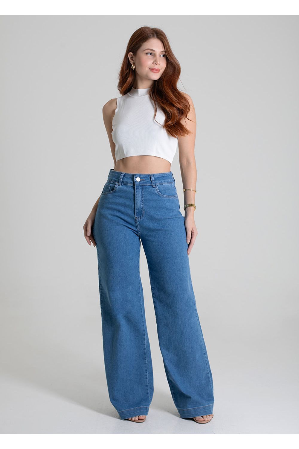 Calça feminina confeccionada em jeans. O modelo possui cintura super alta, gancho no lugar e caimento amplo da coxa até a barra. Cintura alta Fechamento através de um botão e zíper Bolsos frontais e posteriores funcionais Barra simples Tecido: Jeans Tipo de Lavagem: Azul Cor: Azul claro-