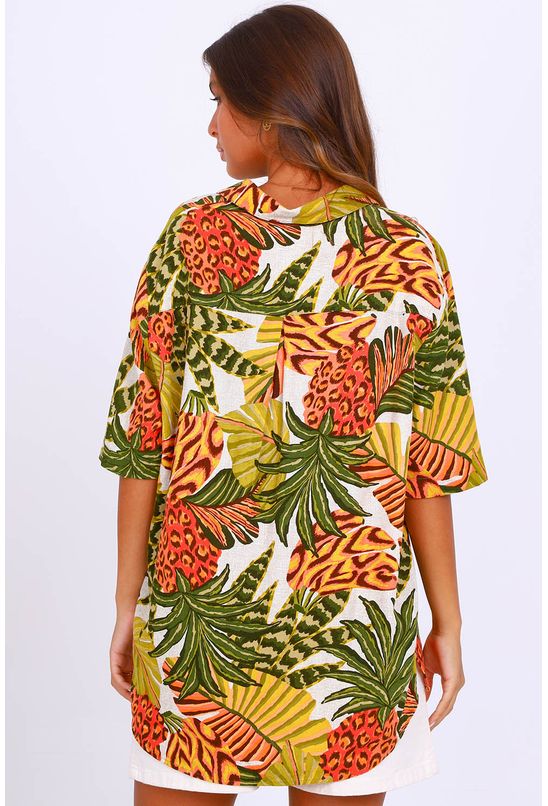 Camisa farm modelo camisas, estampado floral, cor branca, manga curta, tecido linho e viscose. *as peças podem variar a estampa de acordo com o corte.
