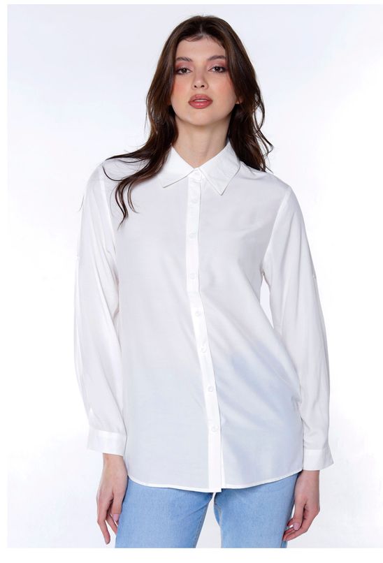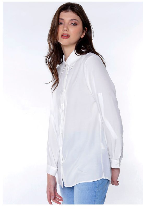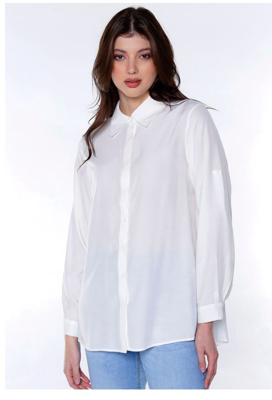 Detalhes do produto: Max camisa feminina, solta, longa em viscose.Vista tradicional com botões da mesma cor. Mangas longas com punhos estreitos, com fechamento em botão. Barra reta na frente com leva curva atrás. Pala com franzido nas costas. Tecido fino, macio, com leve transparência.