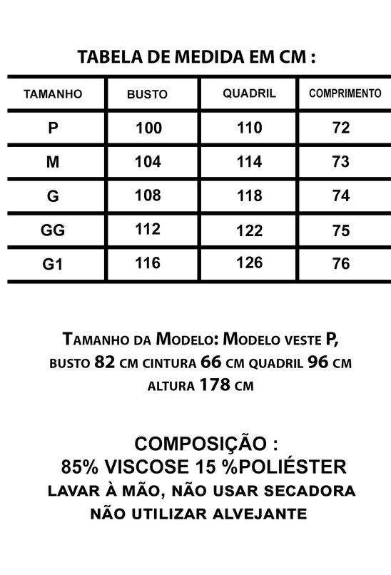 Composição: 85% viscose, 15% poliéster