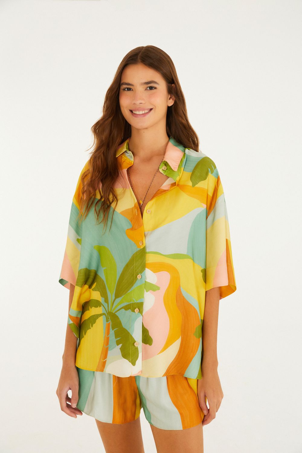 camisa estampada paisagem carioca. traz um corte solto e confortável, com mangas curtas e gola tradicional que oferece versatilidade ao look. o tecido leve e fluido é ideal para dias casuais e eventos ao ar livre, refletindo o espírito vibrante e colorido do rio de janeiro. FARM RIO original - alto verão 26.-