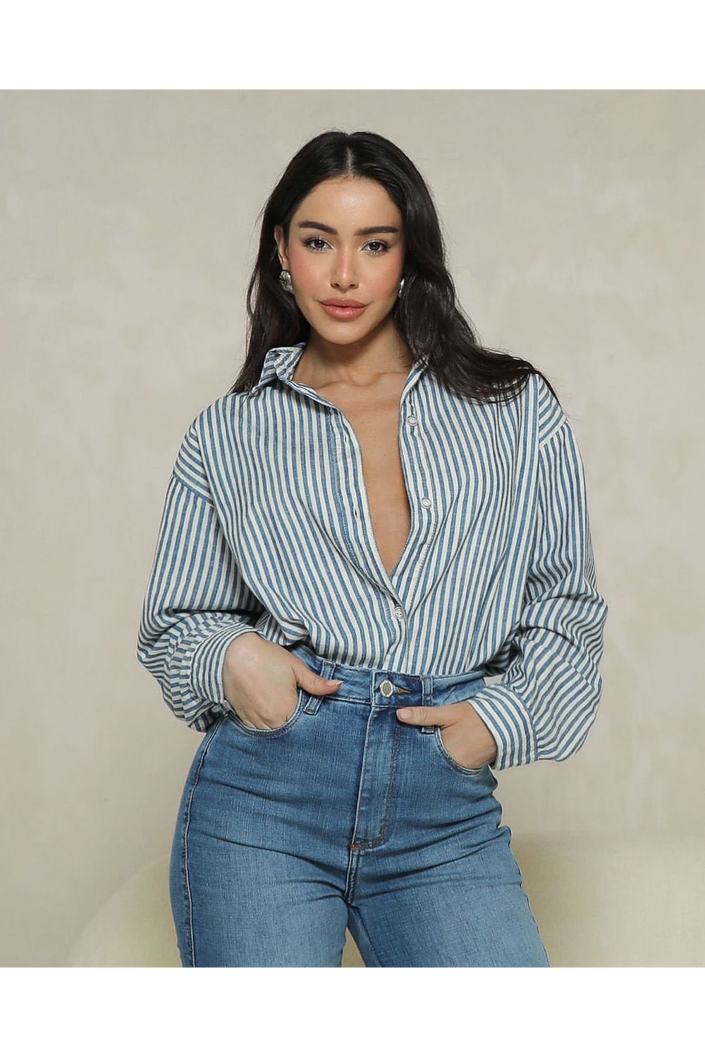 Camisa Feminina Listrada Oversize 24961 Listrado Azul
