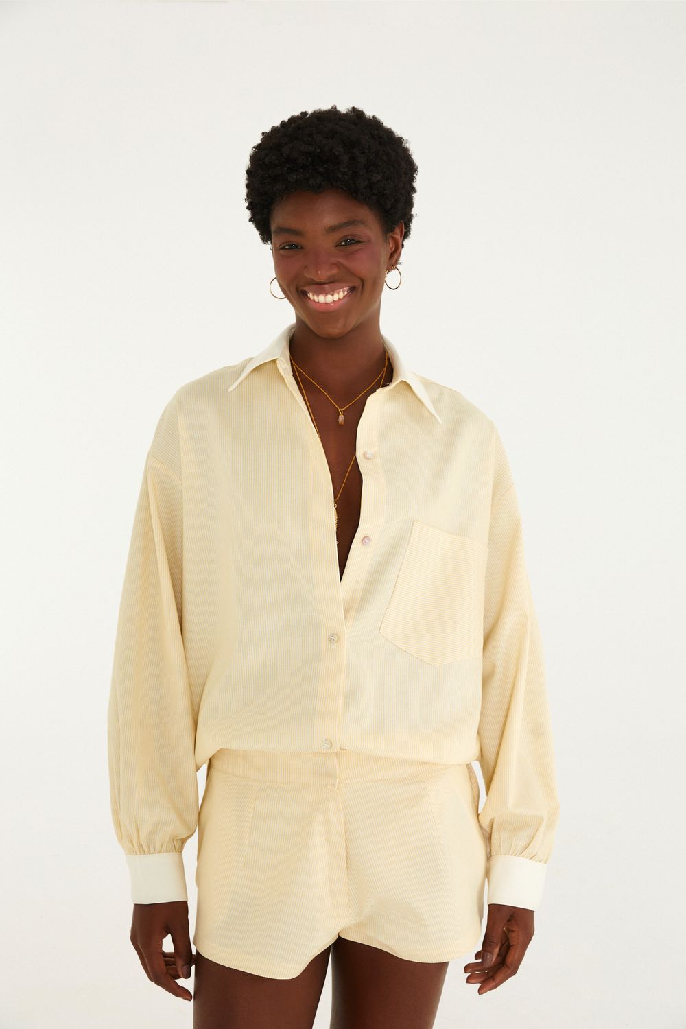 camisa listra alexia. com um corte moderno e casual, esta peça traz mangas longas e punhos largos que dão um toque especial ao visual. o tecido leve proporciona um caimento solto e confortável, ideal para momentos de descontração ou um dia de trabalho. um bolso frontal discreto eleva ainda mais seu charme. FARM Rio, coleção Carioca - inverno 26.-