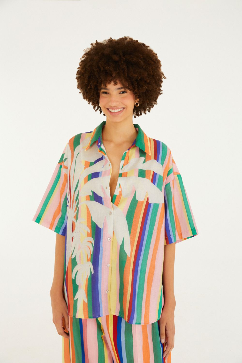 camisa listra bananeira é a peça essencial para compor seu guarda-roupa com estilo. com corte solto e confortável, possui gola clássica e fechamento por botões, oferecendo um toque casual chic. perfeita para combinar com jeans ou saias, em um passeio no parque ou encontro descontraído. FARM Rio, coleção Carioca - inverno 26.-