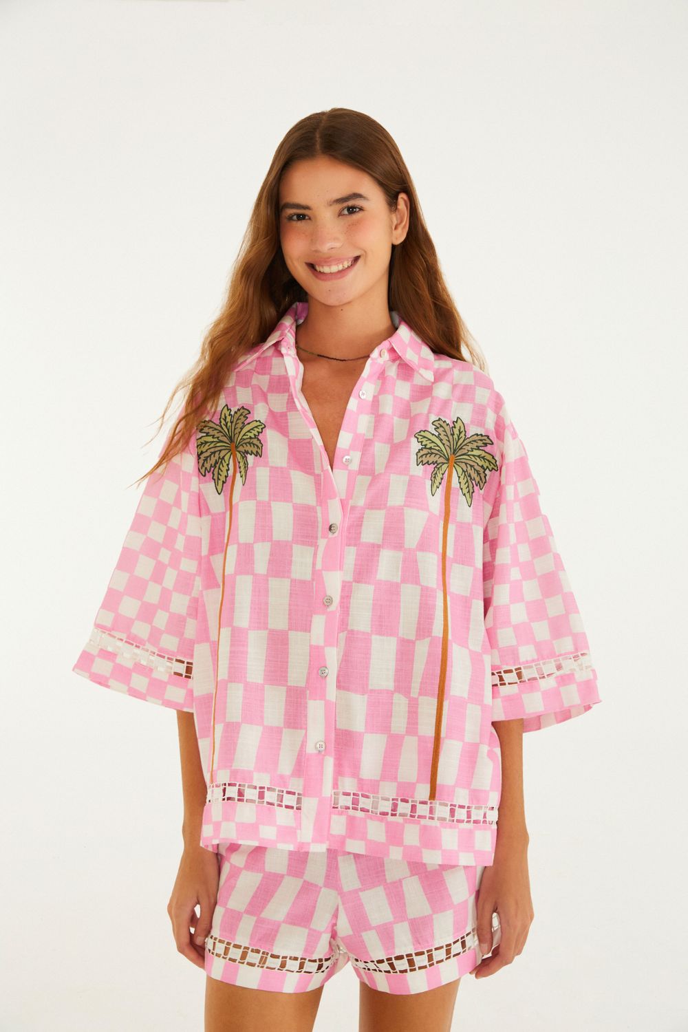 camisa quadriculado sonho. essa peça única possui um estilo casual com mangas amplas e acabamento fluido. os detalhes de amarração no decote adicionam charme, enquanto o caimento leve proporciona conforto absoluto. perfeita para dias de lazer ou um passeio na cidade. FARM RIO original - alto verão 26.-