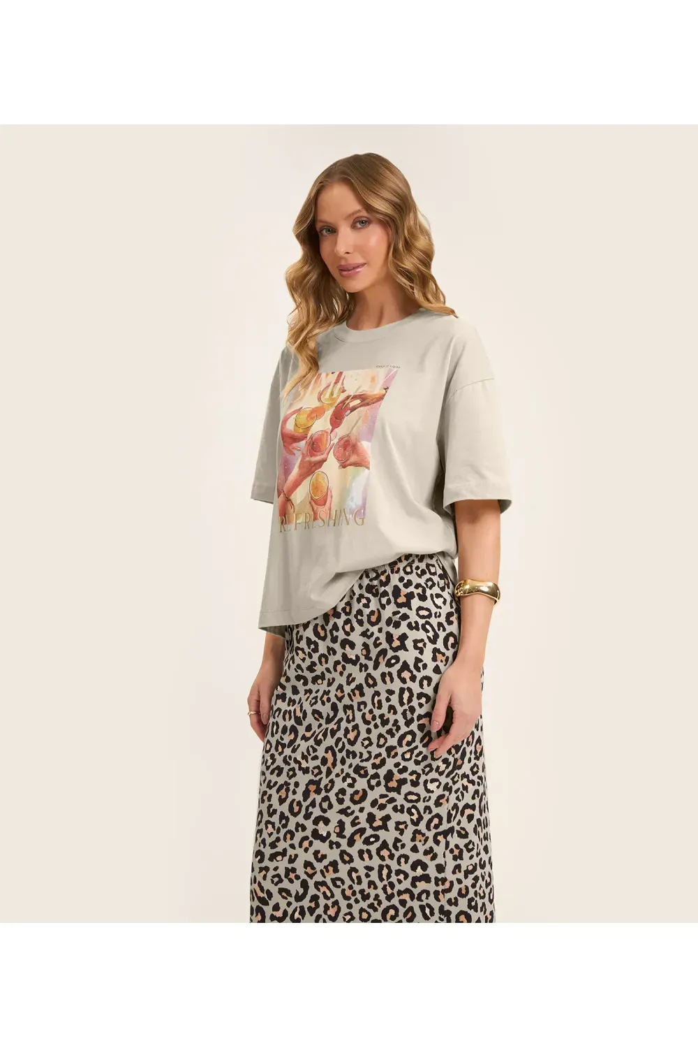 Camiseta feminina Rovitex confeccionada em meia malha, oferecendo conforto e leveza para o dia a dia. Modelo com caimento amplo estilo "over", possui gola com acabamento canelado e pesponto aparente. A peça conta com estampa localizada frontal, que traz um toque moderno e divertido. As mangas e a barra têm acabamento reforçado com costura dupla, garantindo durabilidade. Ideal para compor looks despojados e estilosos.-