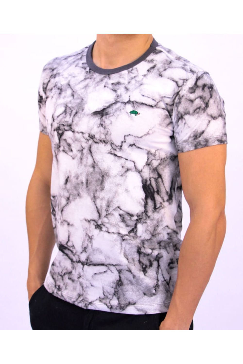 Camiseta manchada, com decote redondo.