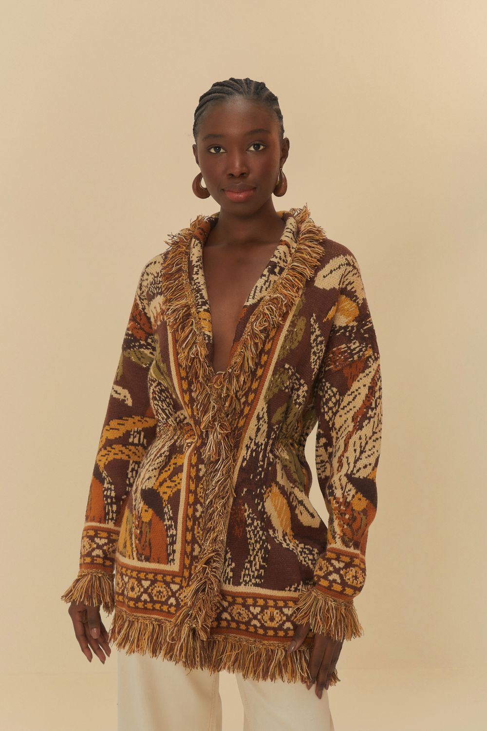 cardigan longo tricot franja estampado floresta. esta peça traz um corte solto com um toque moderno, enriquecido por franjas ao longo das bordas. as mangas longas e o decote em v profundo criam um visual impactante. perfeito para ocasiões casuais ou um passeio no outono. FARM RIO original - inverno 25.-