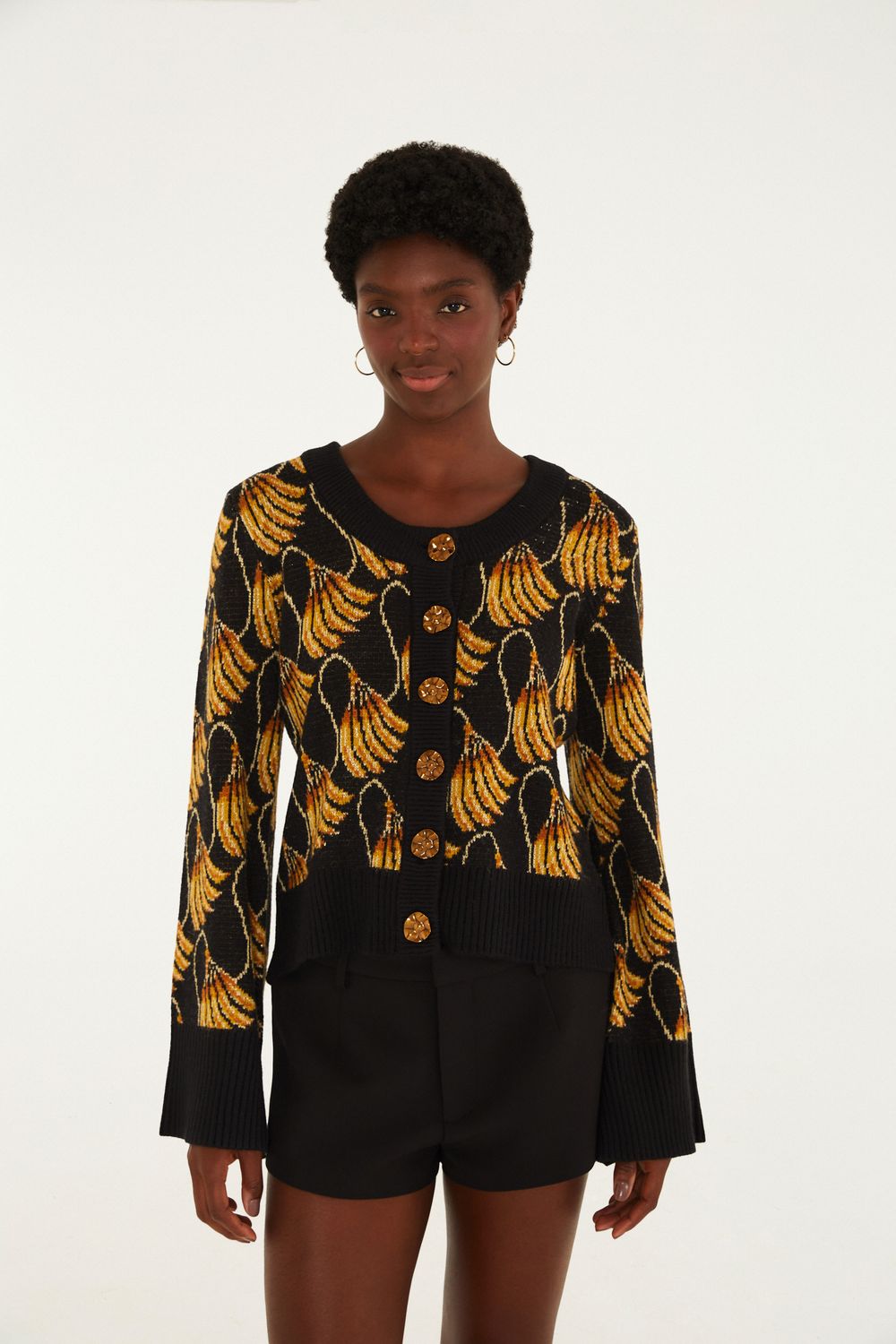 cardigan tricot banana tassel mini traz todo o charme com seu design exclusivo e botões decorativos que adicionam um toque especial. suas mangas longas conferem aconchego e estilo, enquanto o detalhe de tassel nos punhos eleva o visual. perfeito para combinar com saias e calças, é a escolha ideal para um look casual com personalidade. FARM Rio, coleção Carioca - inverno 26.-