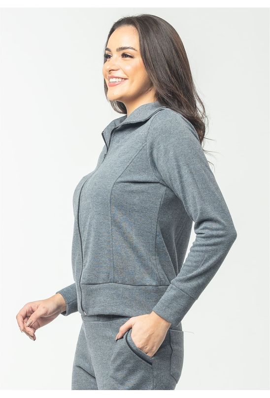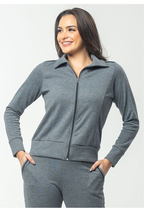 Casaco em Moletinho Chumbo com gola e zíper frontal.