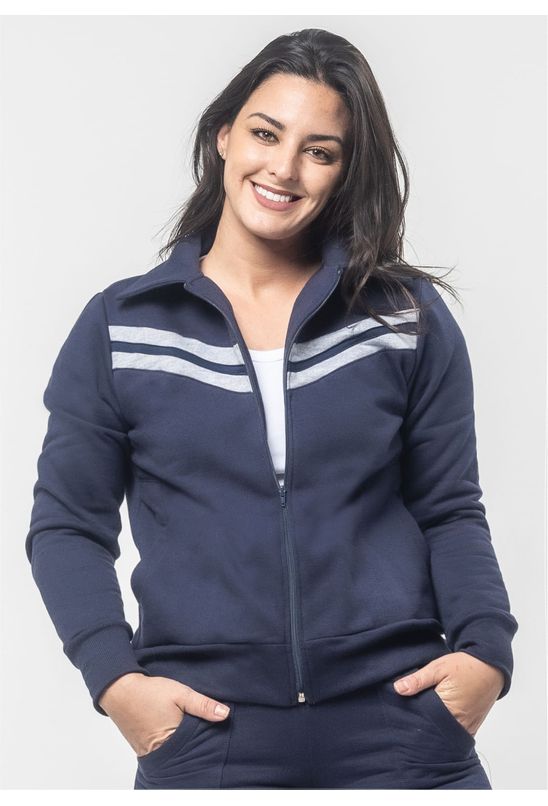 Casaco em Moletom Azul Marinho com gola e zíper frontal.