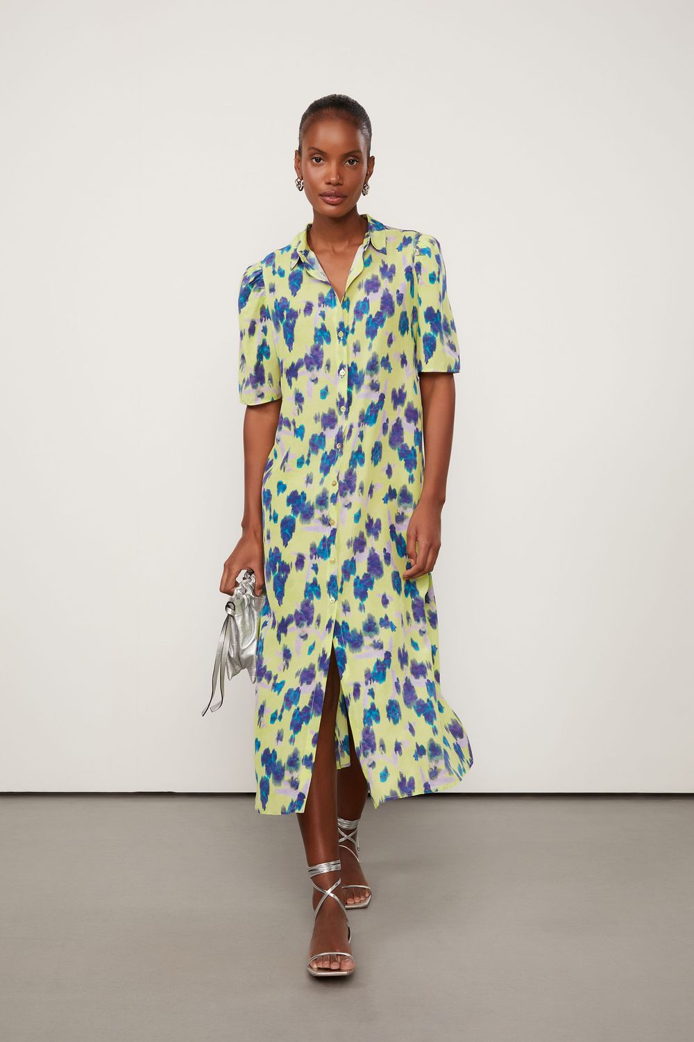 Inspirando uma sensação única de leveza e movimento, a Chemise Midi de Seda traz para a nossa linha best-seller o modelo com mangas curtas com franzido nos ombros formando um leve efeito bufante, abotoamento frontal, gola colarinho, decote em V, shape reto e fenda nas laterais. O destaque principal do vestido é a estampa Floral Vagalume Lima. Sandálias e acessórios metalizados completam a proposta.