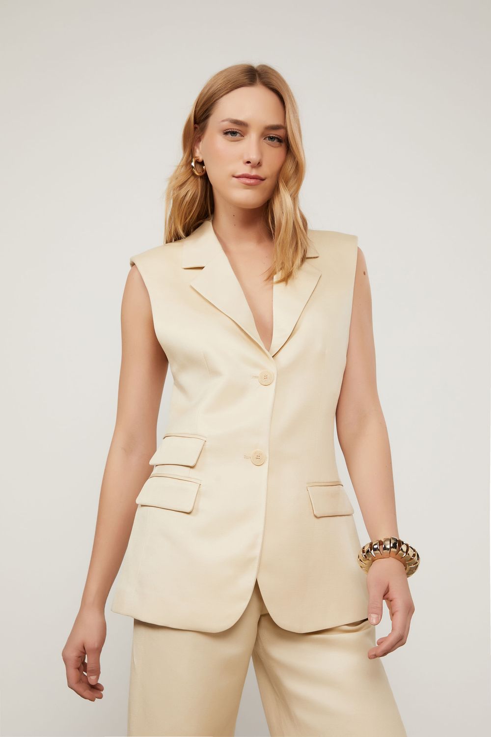 A temporada de verão traz propostas leves para a alfaiataria da coleção, como o Colete na cor Bege Gergelim. O modelo possui fenda nas costas, lapela, bolsos e abotoamento frontal. Para complementar o look, a calça no mesmo estilo, a maxi pulseira e a sandália metalizada, promovem um ar elegante ao visual.