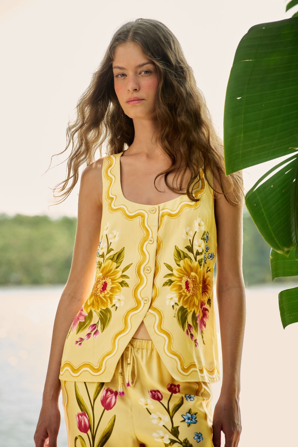 colete estampado floral mari. traz um toque artístico com seu corte diferenciado e delicadas alças largas. a modelagem fluida proporciona leveza e movimento, enquanto os acabamentos ondulados destacam a exclusividade da peça. perfeito para compor looks casuais e frescos em dias ensolarados. FARM RIO original - verão 26.-