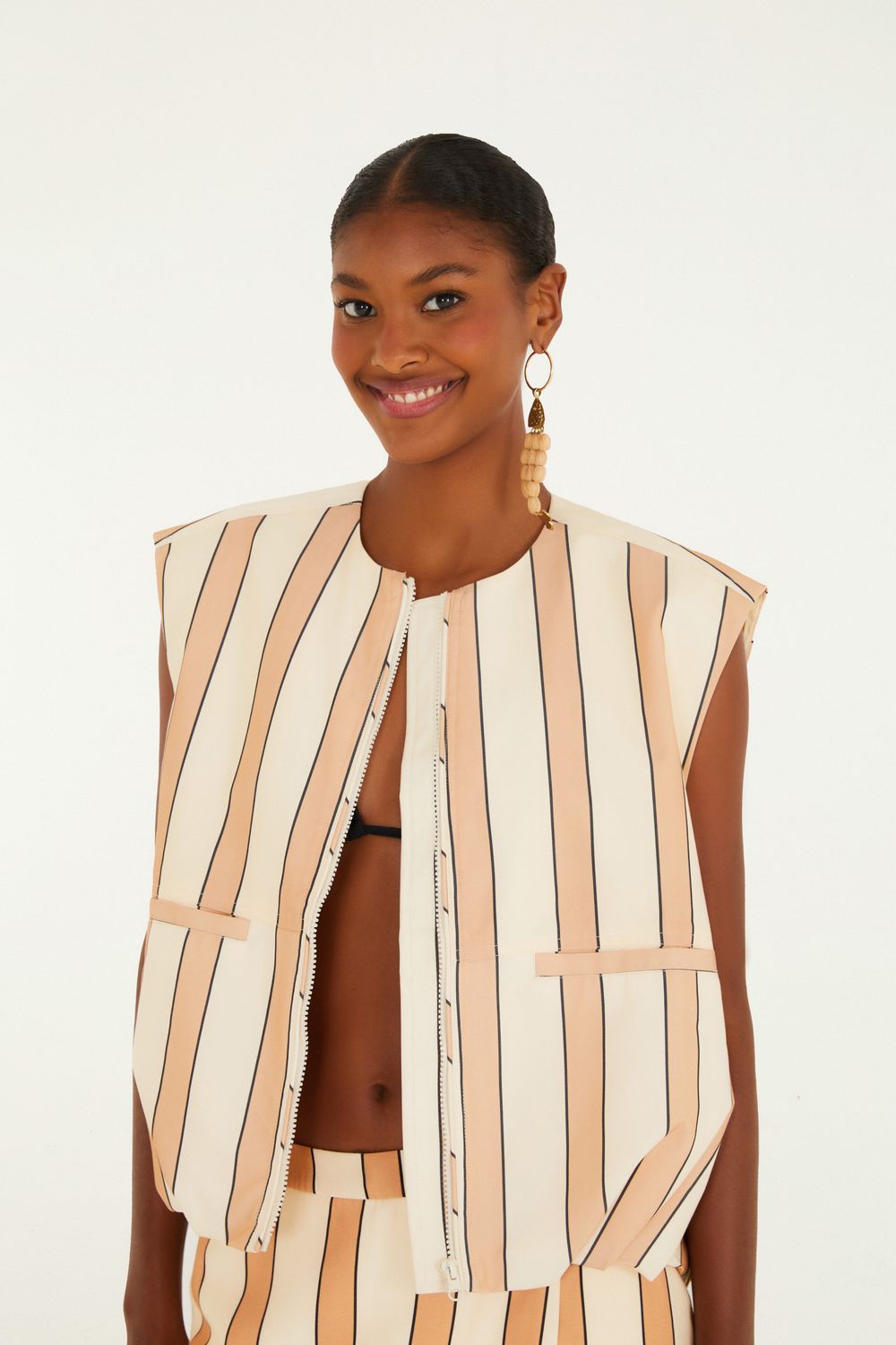 colete listras lene. exala originalidade com suas linhas modernas e modelagem solta, ele é perfeito para composições casuais e elegantes. detalhes como fechamento por botões frontais e bolsos laterais trazem um toque funcional à peça. um convite ao estilo versátil, seja em uma caminhada no parque ou um encontro especial. FARM RIO original - verão 26.-
