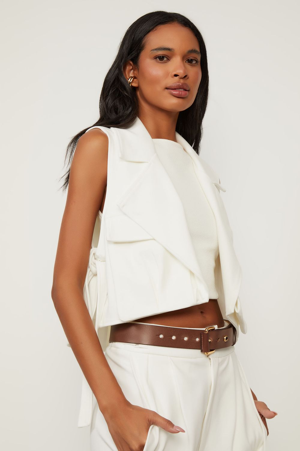 Atualizando os lisos com novos shapes, o Colete de malha surge em comprimento cropped, com lapela e bolsos frontais, amarração regulável nas laterais e pala com prega nas costas. Para complementar o look, a calça no mesmo estilo e os acessórios da coleção, como o maxi óculos e o cinto, trazem um ar moderno e urbano ao visual.