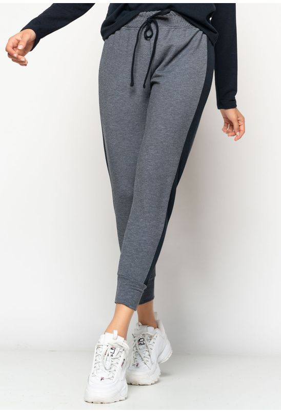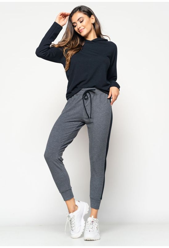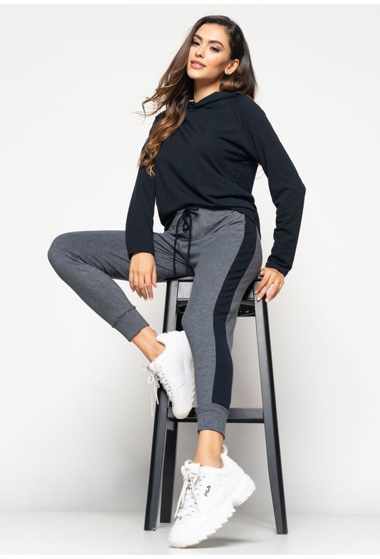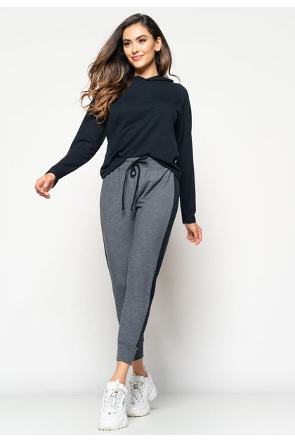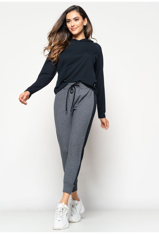 Conjunto Comfy Com Casaco Capuz e Jogger Listra Moletinho Grafite+Preto