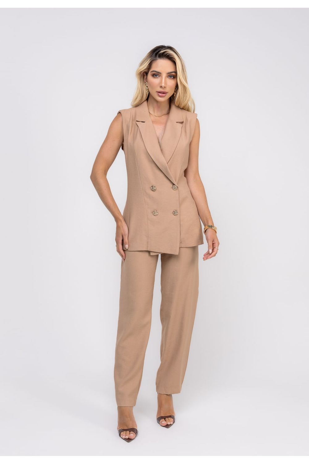 Conjunto Alfaiataria Wide Leg e Colete Bege Salvatore