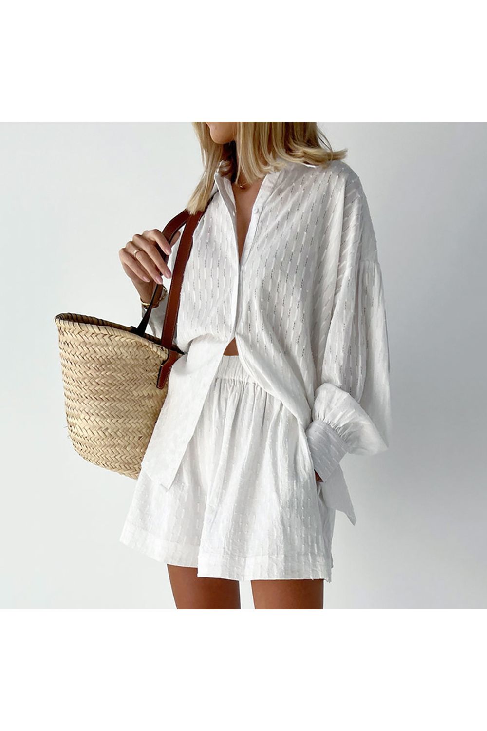 Conjunto camisa manga bufante com punho e short jacquard branco