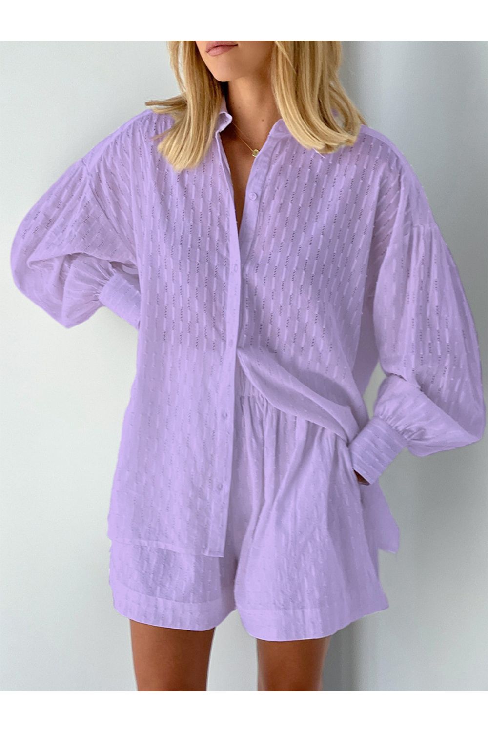 Conjunto camisa manga bufante com punho e short jacquard roxo