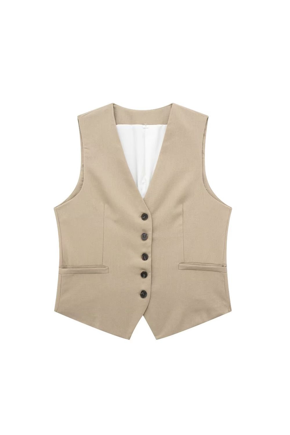 Conjunto colete decote v e short cintura alta alfaiataria bege