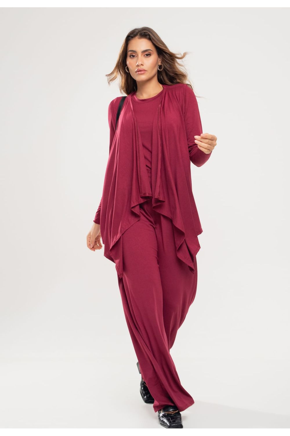 Conjunto Com Kimono, Blusa Manga Longa e Wide Leg Malha Vinho Salvatore