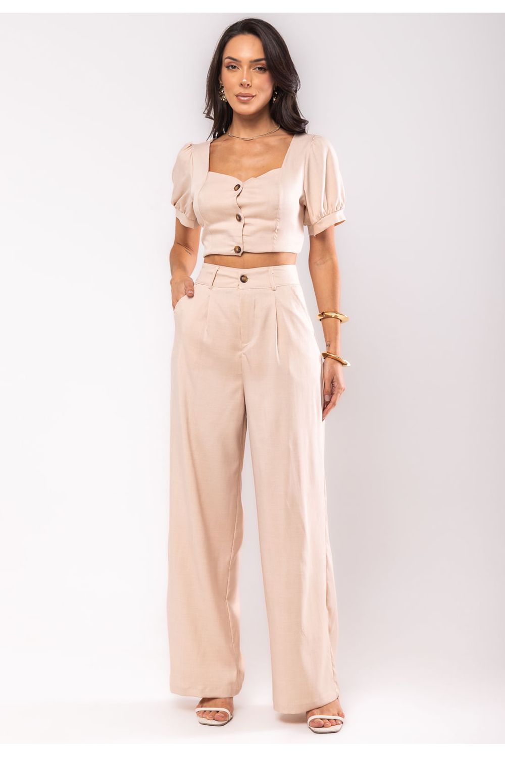 Conjunto de alfaiataria elegante composto por cropped e calça de cintura alta. O cropped apresenta mangas curtas bufantes e um decote quadrado, trazendo um ar romântico e moderno ao visual. Com botões frontais, o modelo valoriza o busto e oferece um caimento sofisticado. A calça wide leg possui corte reto, caimento fluido e fechamento por zíper e botão, garantindo conforto e estilo. Perfeito para compor looks refinados e versáteis, esse conjunto é ideal para eventos formais ou ocasiões mais casuais que pedem um toque de elegância. Combine com sandálias de salto para um visual completo e marcante.