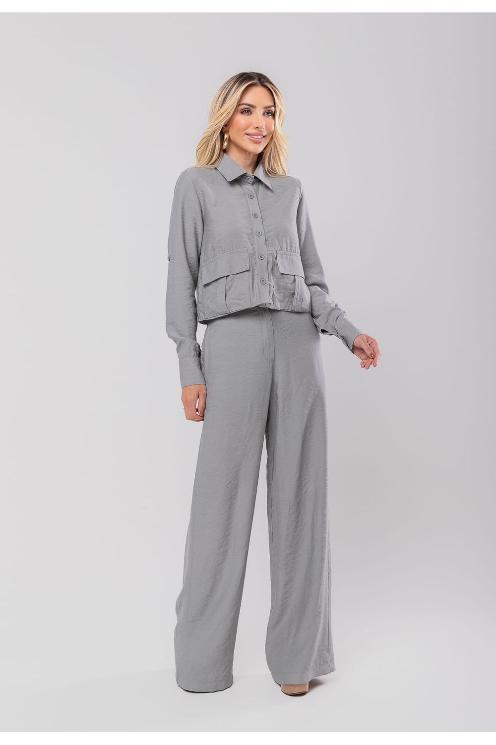 Conjunto Feminino Alfaiataria Cropped e Wide Leg Cinza Salvatore Fashion
