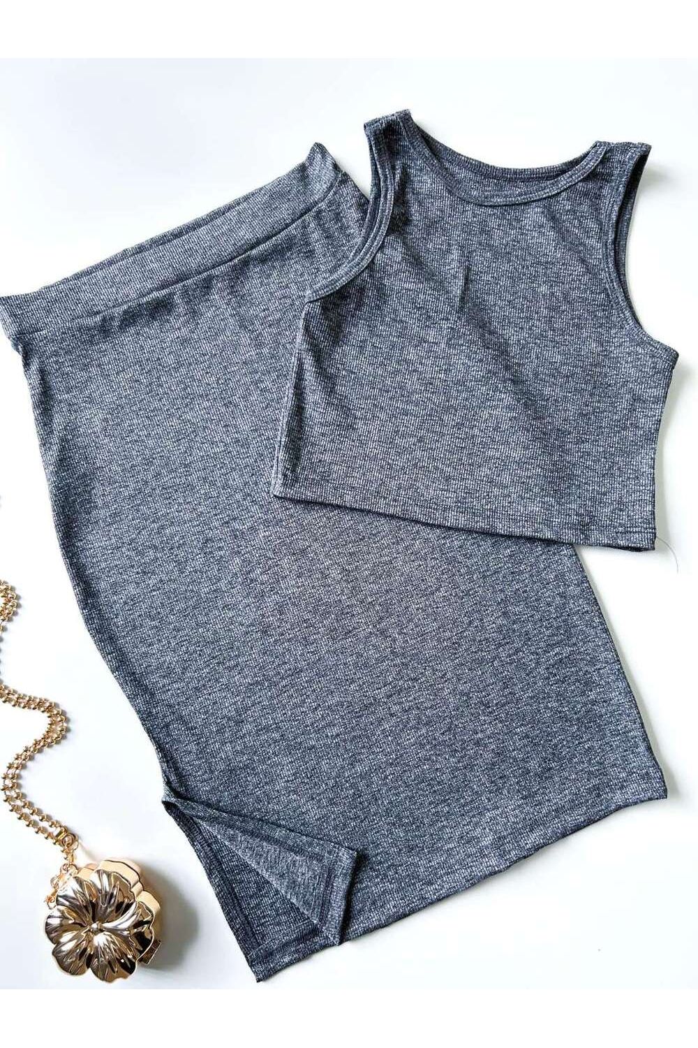 Conjunto Feminino em Ribana Regata e Saia Midi Daniele Ref. 1061 - Cinza mescla - Único
