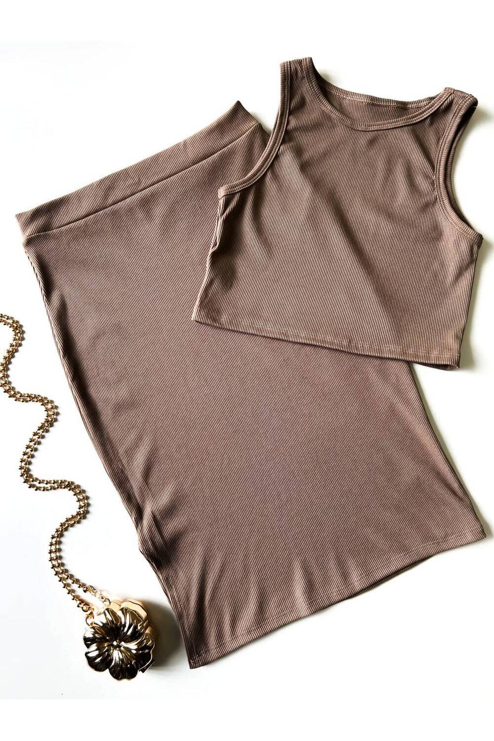 Conjunto Feminino em Ribana Regata e Saia Midi Daniele Ref. 1061 - Bege escuro - Único
