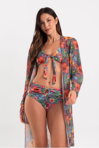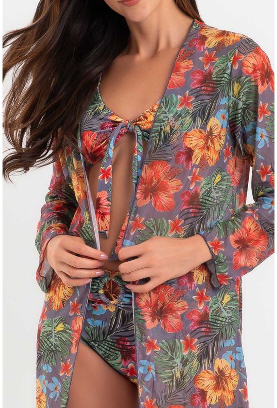 nome: conjunto floral biquíni com saída de praia manga longa cinza