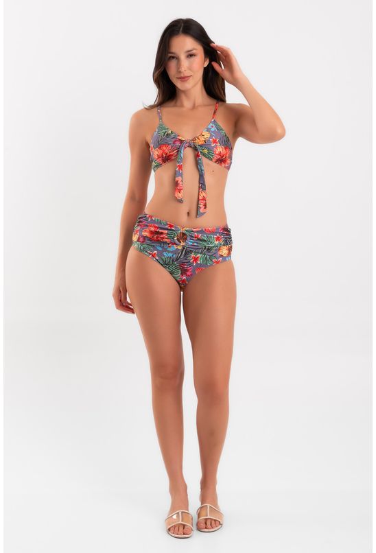 Conjunto floral biquíni com saída de praia manga longa cinza babado