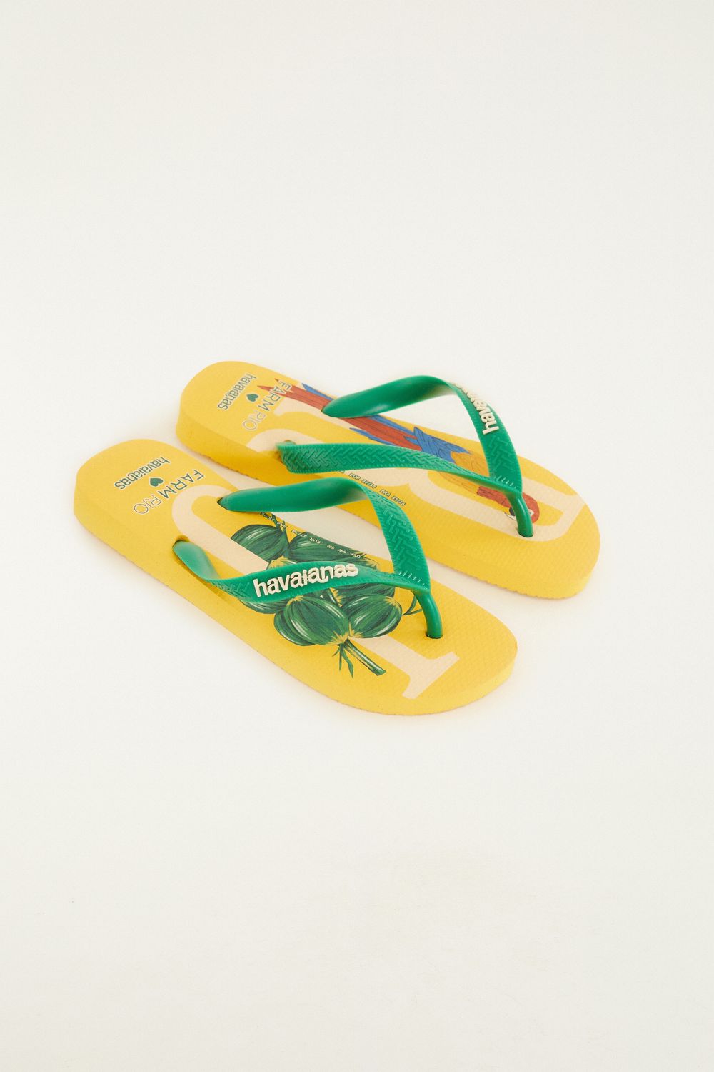 havaianas rj: leve o espírito carioca com você aonde for. com solado confortável e tiras finas que se ajustam suavemente aos pés, este par eleva qualquer visual casual. destaque para as estampas coloridas que trazem a essência da cidade maravilhosa, perfeita para dias ensolarados. este produto faz parte da parceria havaianas <3 FARM Rio.-