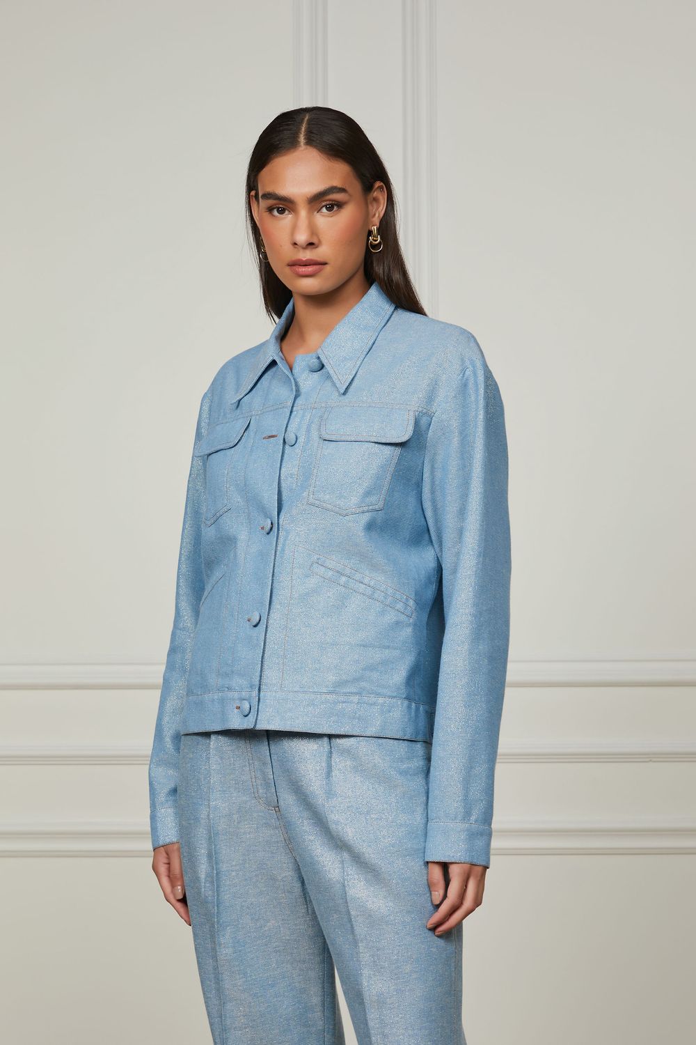 Esta jaqueta de linho misto com leve brilho é a escolha perfeita para transitar entre as estações. Com gola, bolsos funcionais com lapela e fechamento frontal com abotoamento, ela adiciona um toque sofisticado a qualquer look. Experimente combiná-la com uma blusa básica e uma calça de alfaiataria para um visual elegante e moderno. Com caimentos surpreendentes e femininos, o Animale Studio possui looks despretensiosos e sofisticados para a sua jornada cosmopolita.