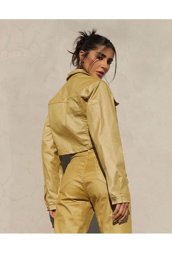 Jaqueta Sarja Resinada Cropped Feminina Color 22751 Ouro