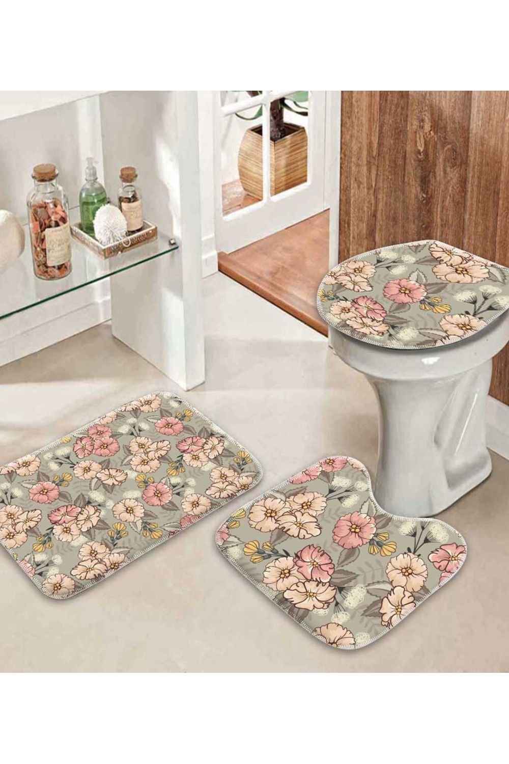 Jogo De Tapetes Para Banheiro Composto por três peças sendo: 1 peça 34cm x 60cm, 1 peça 40cm x 44cm e 1 peça 40cm x 45cm, possui estampa digital de alta qualidade aplicado por termotransferência, base emborrachada antiderrapante. Perfeito para deixar seu ambiente ainda mais aconchegante.-