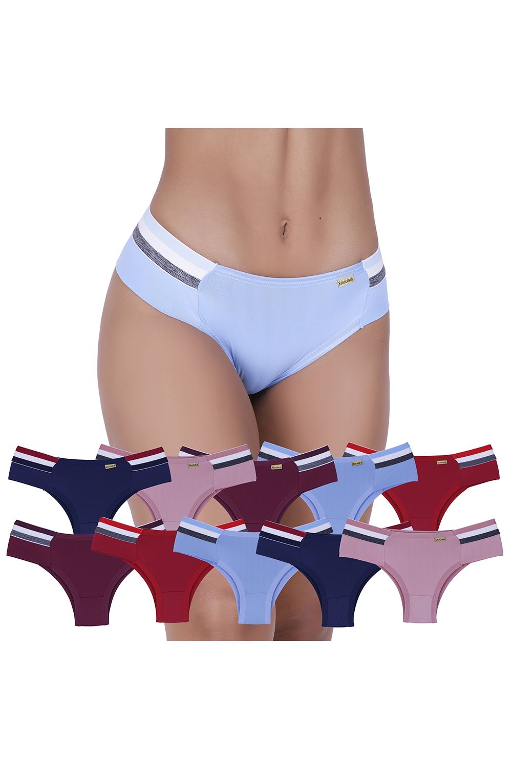 Kit com 10 peças. A calcinha Fashion une uma modelagem básica ao conforto da microfibra, um modelo arrojado e moderno com elástico colorido como detalhe e pala dupla na lateral.
